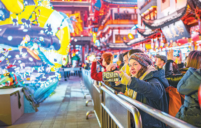 豫园灯会现场,“寰宇东谈主和,金蛇献瑞”灯组劝诱异邦搭客藏身拍摄。