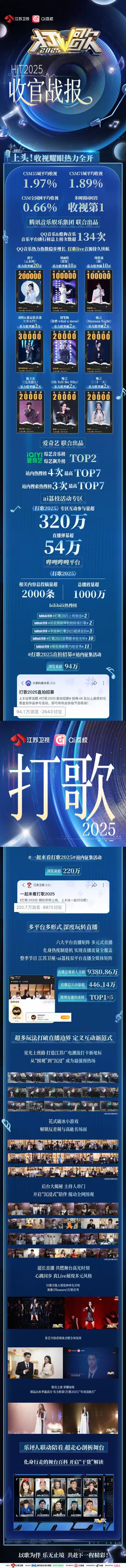 CSM寰宇网平均收视0.66%,在多网别同期段排名第一。此外,江苏卫视与ai荔枝双平台构建的全媒体直播矩阵,已毕直播总不雅看东谈主次进步9380.86万,总互动量突破446.14万。在ai荔枝头内的《打歌2025》专区,用户参与量超320万,直播弹幕超54万。节目获取全网热搜热榜累计777个,其中微博热榜393个、短视频热榜272个、其他客户端热榜热搜112个。节目臆想话题全网曝光量进步9.86亿,短视频播放量突破2.75亿。节目全网爆款内容数目一样可不雅:破万赞内容229条、破十万赞内容28条、破五十万赞内容5条。